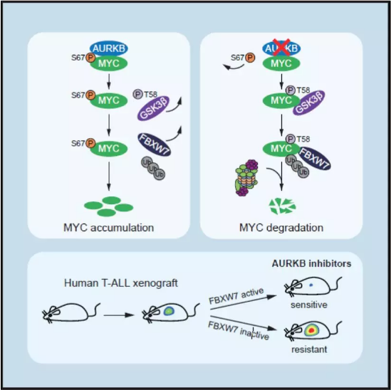 研究人员通过蛋白组学研究,确定了 Aurora 蛋白激酶家族中的 AURKB 可以直接与 MYC 结合,除 AURKB 可显著降低内源性 MYC 的半衰期,表明 AURKB 与 MYC 的稳定性密切相关。利用 RNA 测序技术(上海QY球友会生物提供服务)对 AURKB 敲除后的细胞系进行检测,结果显示 MYC 靶向基因发生了显著变化。进一步的机制研究表明,AURKB 可以磷酸化 MYC 第 67 位丝氨酸(S67),S67 磷酸化会阻碍 MYC 与 GSK3β 的相互作用,抑制 MYC 第 58 位苏氨酸(T58)的磷酸化,从而阻碍 E3 泛素连接酶 FBXW7 与 MYC 的结合,进而阻断 MYC 的降解途径,显著增强 MYC 的稳定性。与此同时,研究发现 TALL 中的 MYC 能够直接激活 AURKB 的转录,形成 AURKB-MYC 正反馈调控环路参与调节 MYC 的致癌作用。通过建立 MYC 介导的 T -ALL 斑马鱼模型,研究人员进一步确定体内 AURKB-MYC 正反馈调控环路对 T -ALL 的发生发展至关重要。