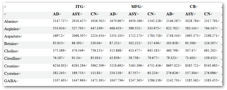 研究者采用 R -Studio1.1.453 和 STATA16.0 软件进行分析。使用 α 值 0.05 来确定统计学意义。同时进行了多重比较方法 Benjamini-Hochberg 错误发现率(FDR=0.05)和 bonferoni 校正(FWER=0.05)。两种比较方法均校正了 52 种比较(26 种代谢物×2 个主要脑部区域 ITG 和 MFG),这些比较是基于它们对不同 AD 病理的易感性而预先指定的。检查了三组(AD,ASY 和 CN)在性别,APOEε4 携带者状态(Fisherexact 试验),年龄和验尸间隔(PMI)(Kruskal-Wallis 测试)方面的差异样。信息如表 2: